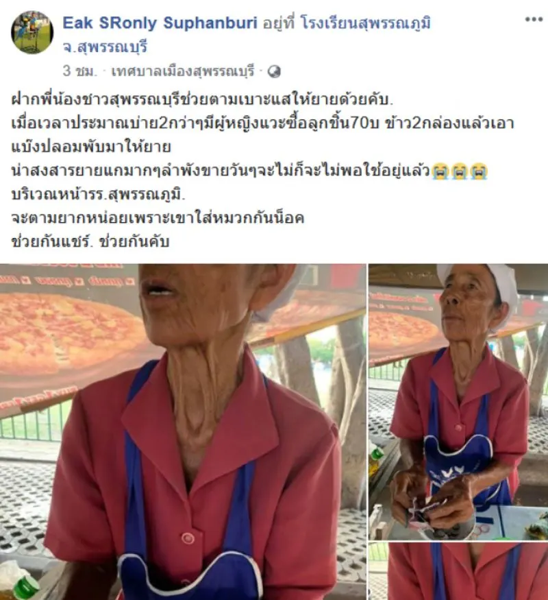 วันที่ 18 ธันวาคม 2562 ทีมข่าว viralsfeedpro รายงานว่า โลกออนไลน์มีการส่งต่อภาพเหตุการณ์ของผู้ใช้เฟซบุ๊กชื่อ Eak SRonly Suphanburi ซึ่งเป็นภาพของป้าท่านหนึ่งที่กำลังถือธนบัตรปลอม โดยผู้ใช้เฟซบุ๊กดังกล่าวระบุข้อความว่า ฝากพี่น้องชาวสุพรรณบุรีช่วยตามเบาะแสให้คุณป้าด้วยครับ เมื่อเวลาประมาณบ่าย2กว่าๆมีผู้หญิงแวะซื้อลูกชิ้น70 บาท ข้าว 2 กล่องแล้วเอาแบงค์ปลอมพับมาให้คุณป้า น่าสงสารป้าแกมากๆลำพังขายวันๆจะไม่ก็จะไม่พอใช้อยู่แล้ว บริเวณหน้ารร สุพรรณภูมิ จะตามยากหน่อยเพราะเขาใส่หมวกกันน็อค ช่วยกันครับ