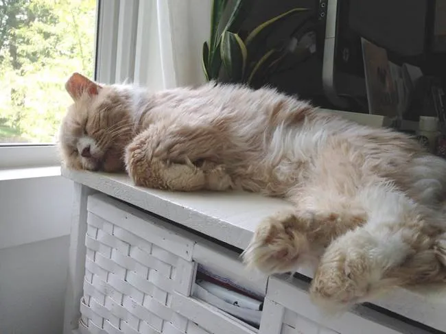 เจ้า Frisbee พบเก้าอี้ตัวโปรดในบ้าน ขนของมันเริ่มยาวและในไม่ช้ามันจะหนาขึ้นอย่างงดงาม