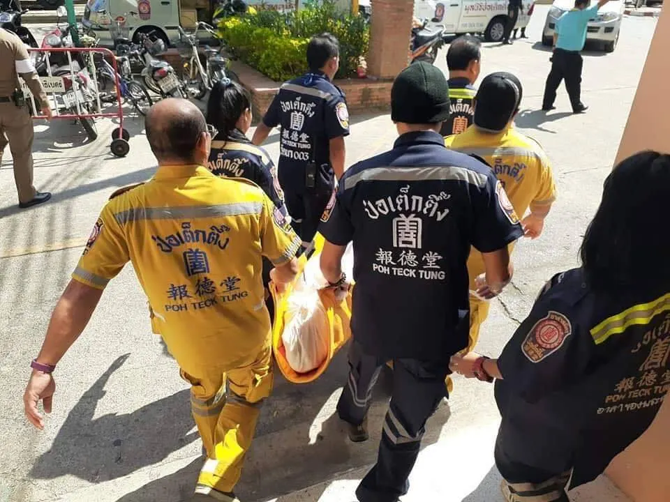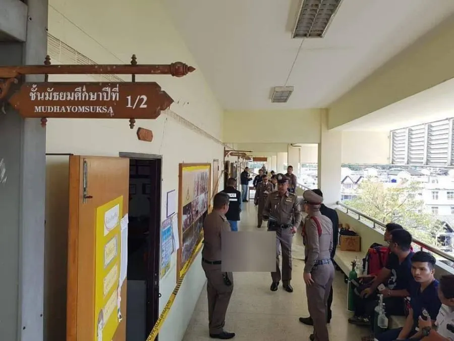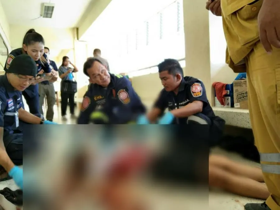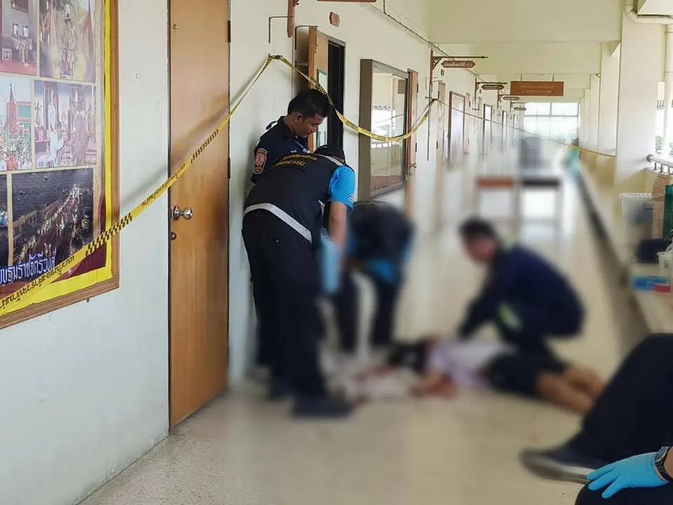 พบเจ้าหน้าที่มูลนิธิป่อเต็กตึ๊งกำลังช่วยเหลือทำซีพีอาร์กู้ชีวิต เด็กชายวัย 14 ปี ถูกยิงเข้าที่บริเวณศีรษะ 1 นัด หน้าห้องเรียนชั้น ม.1/2 บริเวณชั้น 5 ของตึกอาคารเรียน
