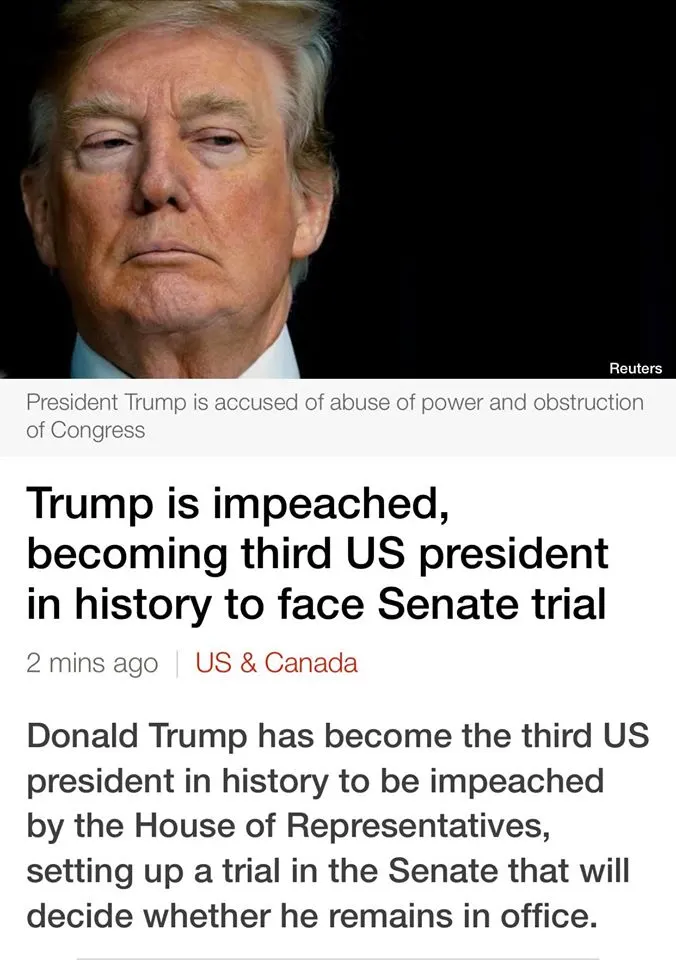 ส่งผลให้นายโดนัลด์ ทรัมป์ กลายเป็นประธานาธิบดีสหรัฐคนที่ 3 ในประวัติศาสตร์ของสหรัฐที่ถูกมติถอดถอนจากสมาชิกสภาผู้แทนราษฎร หรือสภาล่างของสหรัฐ จากนี้เข้าสู่ขั้นตอนต่อไป ด้วยการส่งต่อให้วุฒิสมาชิกหรือสว.ของสภาสหรัฐในเดือนมกราคมปีหน้า