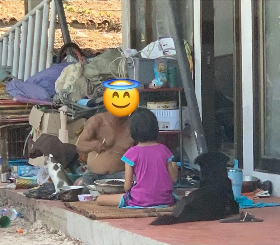 เป็นภาพที่แอบถ่ายมา เพราะรู้สึกดีมากๆ ระหว่างรอพี่สาวทำธุระ ก็จะต้องมาจอดรอตรงนี้ทุกครั้ง เลยได้เห็นอะไรดีดี บ้านนี้ทำอาชีพเก็บของเก่าขาย วันนี้นั่งกินหมูกะทะกันหน้าบ้าน พ่อลูก (แม่หั่นหมูอยู่ข้างใน) คนพ่อกำลังเป่าหมูให้ลูกสาวกับน้องแมว (น้องแมวนั่งอยู่ข้างๆพ่อ) ส่วนลูกสาวได้หมูมาหนึ่งคำ แบ่งให้น้องหมาครึ่งนึง น่ารักทั้งบ้านเลยบ้านนี้ บางครั้งการได้มาเจอได้มาเห็นอะไรแบบนี้ มันก็สามารถทำให้หัวใจคนๆนึงพองโตและเป็นสุขได้เหมือนกันนะ