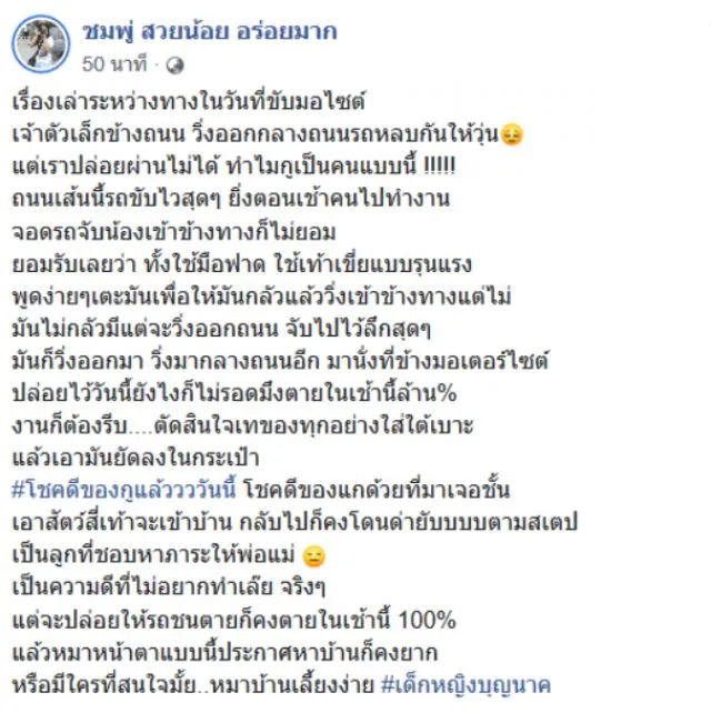 หญิงสาวรายหนึ่งกำลังขับมอเตอร์ไซค์ไปทำงาน บังเอิญเจอสิ่งมีชีวิตเล็กๆวิ่งไปกลางถนน รีบจอดรถทันที ทำทุกอย่างเพื่อให้มันเข้าข้างทางให้ได้ กลัวจะไม่ปลอดภัย เมื่อวันที่ 19 ธันวคม มีผู้ใช้เฟสบุ๊ครายหนึ่งใช้ชื่อว่า ชมพู่ สวยน้อย อร่อยมาก ได้โพสต์ข้อความระบุว่า เรื่องเล่าระหว่างทางในวันที่ขับมอไซต์ เจ้าตัวเล็กข้างถนน วิ่งออกกลางถนนรถหลบกันให้วุ่น แต่เราปล่อยผ่านไม่ได้ ทำไมเราเป็นคนแบบนี้ ถนนเส้นนี้รถขับไวมากๆ ยิ่งตอนเช้าคนไปทำงาน จอดรถจับน้องเข้าข้างทางก็ไม่ยอม ยอมรับเลยว่า ทั้งใช้มือ เท้า ให้มันกลัวแล้ววิ่งเข้าข้างทาง แต่ไม่ มันไม่กลัวมีแต่จะวิ่งออกถนน จับไปไว้ลึกสุดๆ มันก็วิ่งออกมา วิ่งมากลางถนนอีก มานั่งที่ข้างมอเตอร์ไซค์ ปล่อยไว้วันนี้แย่แน่