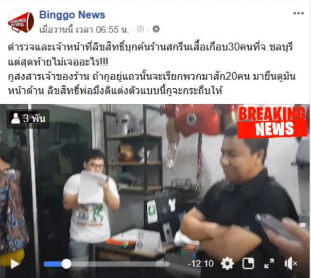 เป็นเรื่องของลิขสิทธิ์อีกแล้ว เมื่อตำรวจและเจ้าหน้าที่ลิขสิทธิ์ ค้นร้านสกรีนเสื้อเกือบ30คน ได้เข้าตรวจค้นร้านสกรีนเสื้อผ้า เมื่อวันที่ 18 ธันวาคม ที่ผ่านมา เพจ Binggo News ได้โพสต์ข้อความระบุว่า ตำรวจและเจ้าหน้าที่ลิขสิทธิ์ ค้นร้านสกรีนเสื้อเกือบ30คนที่ จังหวัดชลบุรีแต่สุดท้ายไม่เจออะไร สงสารเจ้าของร้าน ถ้าผมอยู่แถวนั้นจะเรียกพวกมาสัก20คน มายืนดู ลิขสิทธิ์อะรไแต่งตัวแบบนี้