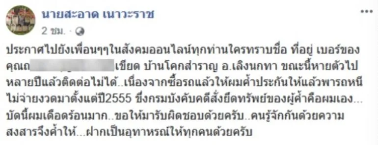 เช่นเดียวกับเรื่องราวดังต่อไปนี้ เมื่อผู้ใช้เฟซบุ๊ก นายสะอาด เนาวะราช ได้เผนแพร่เรื่องราวอุทาหรณ์ระบุข้อความว่า ประกาศไปยังเพื่อนๆๆในสังคมออนไลน์ทุกท่านใครทราบชื่อ ที่อยู่ เบอร์ของคุณถนอม บุญจิตร หรือเขียด บ้านโคกสำราญ อ.เลิงนกทา