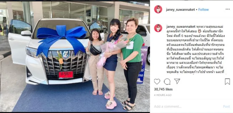 ทุกความสุขของแม่ ลูกคนนี้ทำให้ได้เสมอ ต้อนรับสมาชิกใหม่ คันที่ 6 ของบ้านแล้วนะ มีวันนี้ได้ต้องขอบคุณทุกๆคนที่เข้ามาในชีวิต ทั้งครอบครัวตลอดจนไปถึงแฟนคลับที่น่ารักทุกคน ที่เป็นแรงผลักดัน ให้เด็กบ้านนอกจนๆคนนึง ได้เดินตามฝัน และประสบความสำเร็จมาได้จนถึงตอนนี้ จะไม่ขอสัญญาอะไรให้มากมาย แต่จะลงมือทำให้ทุกคนเห็นไปเรื่อยๆ ว่าเด็กคนนี้จะไม่หยุดพัฒนา จะไม่หยุดเดิน จะไม่หยุดก้าวไปข้างหน้า และที่สำคัญที่สุด ลูกคนนี้จะทำให้แม่มีความสุขที่สุด แม่จะอยู่กับหนูไปนานๆนะคะ