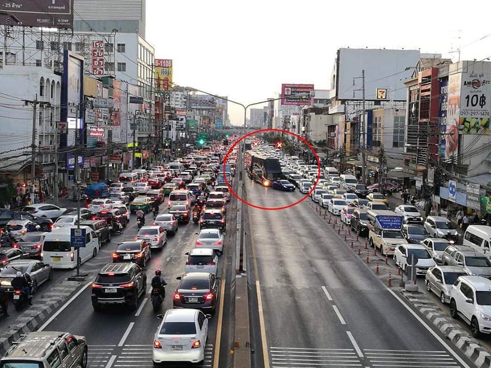 โดยผู้ใช้ทางถ่ายภาพการจราจรที่ติดขัดอย่างหนักบนถ.งามวงศ์วานช่วงเย็นของวันที่ 18 ธ.ค.62 ที่ผ่านมา โดยสาเหตุคือกลุ่มรถทัวร์โดยสาร 3 คัน ขับตามกันมาในช่องทางขวาและปาดเข้าเส้นทึบคอสะพาน ที่คาดว่าจะเป็นสะพานข้ามแยกพงษ์เพชรเพื่อกลับรถ