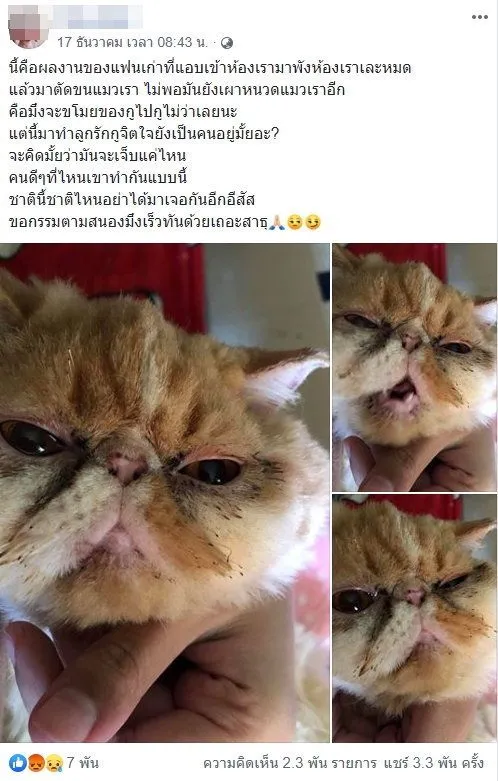 ” นี่คือผลงานของแฟนเก่าที่แอบเข้าห้องเรา มาพังห้องเราเละหมด แล้วมาตัดขนแมวเรา ไม่พอมันยังเผาหนวดแมวเราอีก คือมึงจะขโมยของไป ไม่ว่าเลยนะ แต่นี้มาทำลูกรัก จิตใจยังเป็นคนอยู่มั้ยอะ?