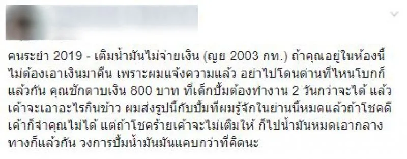 โดยมีข้อความระบุว่า เติมน้ำมันไม่จ่ายเงิน ญย 2003 กรุงเทพมหานคร ถ้าคุณอยู่ในห้องนี้ ไม่ต้องเอาเงินมาคืน เพราะผมแจ้งความแล้ว อย่าไปโดนด่านที่ไหนโบกก็แล้วกัน คุณไม่จ่ายเงิน 800 บาท ที่เด็กปั้มต้องทำงาน 2 วันกว่าจะได้ แล้วเค้าจะเอาอะไรกินข้าว ผมส่งรูปนี้กับปั้มที่ผมรู้จักในย่านนี้หมดแล้ว ถ้าโชคดีเค้าก็จำคุณไม่ได้ แต่ถ้าโชคร้ายเค้าจะไม่เติมให้ ก็ไปน้ำมันหมดเอากลางทางก็แล้วกัน วงการปั้มน้ำมันมันแคบกว่าที่คิดนะ