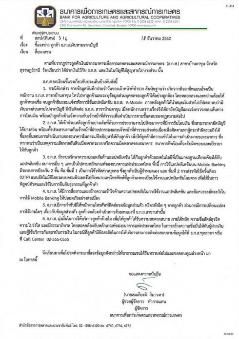 ล่าสุด วันที่ 20 ธันวาคม ผู้สื่อข่าวรายงานว่า ธนาคารเพื่อการเกษตรและสหกรณ์การเกษตร ธกส ออกแถลงการณ์ชี้แจง กรณีลูกค้าเงินฝากธนาคาร ธกส สาขาบ้านตาขุน จังหวัดสุราษฎร์ธนานี เงินในบัญชีสูญหาย ระบุว่า กรณีดังกล่าวลูกค้าถูกมิจฉาชีพหลอกลวงจนยอมแจ้งรหัสการใช้แอพพลิเคชั่นของธนาคารไป โดยธนาคารได้ประสานธนาคารรับโอนและอายัดบัญชีได้บางส่วน และนำลูกค้าแจ้งความกับเจ้าหน้าที่ตำรวจแล้ว ชี้ระบบปลอดภัยมีมาตรฐาน