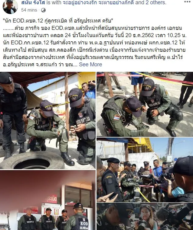 ด้านทาง ผู้ใช้เฟซบุ๊ค สนั่น รังใส หัวหน้าชุดเก็บกู้ฯ เผยความคืบหน้ากรณีดังกล่าวว่า สว.กก.ตชด.12(กทบ.) เป็น หน.ชุด พร้อมชุดปฏิบัติการเข้าทำการตรวจสอบวัตถุระเบิดดังกล่าว โดยมี ท่าน ผกก.สภ.คลองลึก เป็นผู้ควบคุมการปฏิบัติ จากการตรวจสอบ พบ ลูกระเบิดขว้าง K 412 จำนวน 1 ลูก สีเขียวขี้ม้า มีสีฟ้าคาดที่กระเดื่องนิรภัย