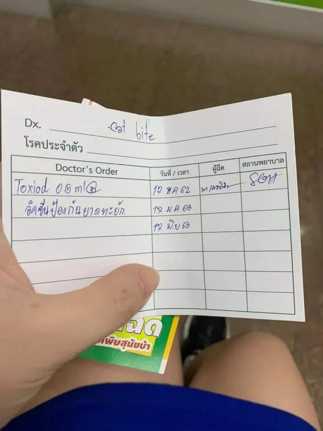 ทำให้เธอตัดสินใจซื้ออาหารแมวมาล่อ แล้วค่อยๆ เดินมาดู แหมมมม เจอกำลังก้มหน้า ก้มตากิน สงสัยจะหิว เธอเลยคว้าตัวมับเข้าให้ แต่น้องร้องแง้วววว น้องน่าจะตกใจ แล้วงับเข้าที่นิ้วชี้เป็นแผลอย่างที่เห็น ถามว่าโกรธไหม ไม่เลยดีใจที่จับได้ เพราะมีพี่ที่ทำงานเขารับไปเลี้ยงแล้ว