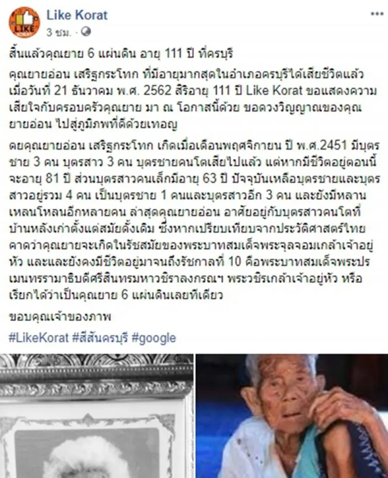 วันนี้ 21 ธ ค 62 ทางเพจ Like Korat ได้มีการโพสต์ภาพพร้อมข้อความว่า สิ้นแล้วคุณยาย 6 แผ่นดิน อายุ 111 ปี ที่ครบุรี คุณยายอ่อน เสริฐกระโทก ที่มีอายุมากสุดในอำเภอครบุรีได้เสียชีวิตแล้วเมื่อวันที่ 21 ธันวาคม พศ 2562 สิริอายุ 111 ปี Like Korat ขอแสดงความเสียใจกับครอบครัวคุณยาย มา ณ โอกาสนี้ด้วย ขอดวงวิญญาณของคุณยายอ่อน ไปสู่ภูมิภพที่ดีด้วยเทอญ