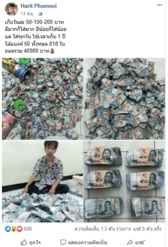 ผู้โพสต์ระบุข้อความว่า เก็บเงินวันละ 50-100-200 บาท มีมากใส่มาก มีน้อยใส่น้อย แต่ใส่ทุกวัน ใช้เวลาเก็บ 1 ปี ได้แบงค์ 50 ทั้งหมด 818 ใบ ยอดรวม 40900 บาท