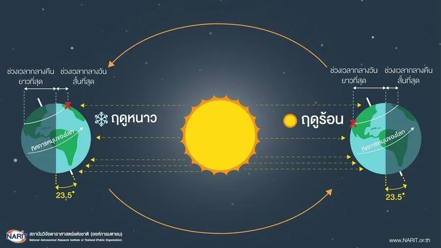 นายศุภฤกษ์ อธิบายเพิ่มเติมว่า โลกโคจรรอบดวงอาทิตย์เป็นวงรี ในรอบหนึ่งปี โลกจึงมีระยะห่างจากดวงอาทิตย์ไม่เท่ากัน ช่วงใกล้ที่สุดประมาณต้นเดือนมกราคม (147 ล้านกิโลเมตร) และช่วงไกลที่สุดประมาณต้นเดือนกรกฎาคม (152 ล้านกิโลเมตร) เมื่อเปรียบเทียบความแตกต่างของระยะทางใกล้-ไกล ในการโคจรของโลกรอบดวงอาทิตย์ ถือเป็นอัตราส่วนที่น้อยมาก จึงไม่มีผลต่อการเกิดฤดูกาลแต่อย่างใด แต่การที่แกนหมุนของโลกเอียงทำมุม 23.5 องศา จากแนวตั้งฉากของระนาบวงโคจรของโลกรอบดวงอาทิตย์ พื้นที่ต่าง ๆ ทั่วโลกจึงรับแสงอาทิตย์ได้ในปริมาณไม่เท่ากัน ส่งผลให้มีอุณภูมิต่างกัน รวมถึงมีระยะเวลากลางวันและกลางคืนที่ต่างกันด้วย เป็นเหตุให้เกิดฤดูกาลขึ้นบนโลก จะสังเกตได้ว่า ในฤดูร้อน เวลากลางวันจะยาวกว่ากลางคืน ดวงอาทิตย์จะขึ้นเร็วและตกช้า ส่วนในฤดูหนาว เวลากลางคืนจะยาวนานกว่า ดวงอาทิตย์จะขึ้นช้าและตกเร็ว