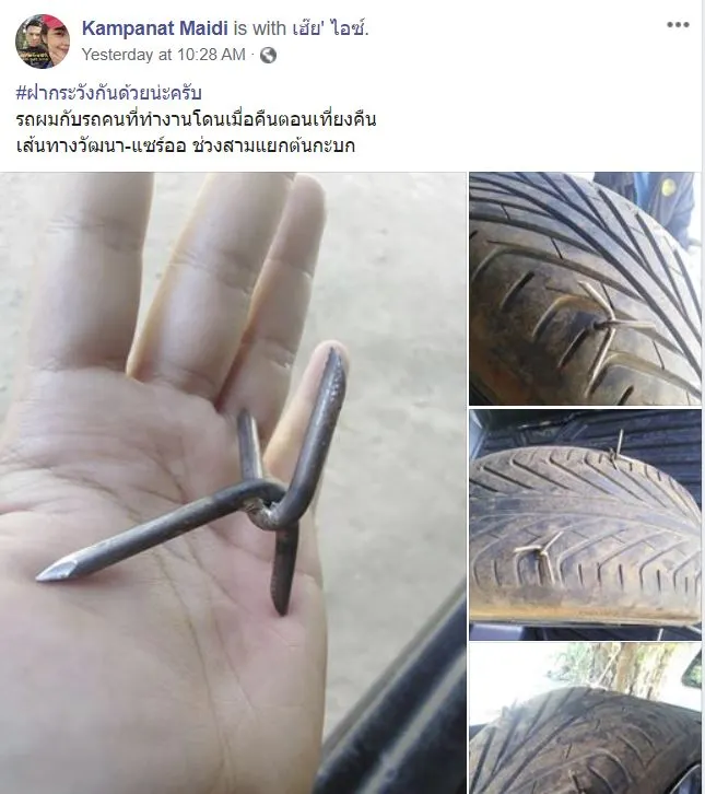 หนุ่มชาวจังหวัดสระเเก้วออกโรงโพสต์เตือนภัย สำหรับผู้ใช้รถใช้ถนนในยามค่้ำคืน เจอกับวัตถุอันรายบนถนนเเบบไม่คาดคิด เสี่ยงต่อการเกิดอุบัติเหตุ หรืออาจจะเป็นกลวิธีของบรรดาร้านยางที่หัวหมอ ทำให้มีลูกค้าไปใช้บริการเยอะๆ