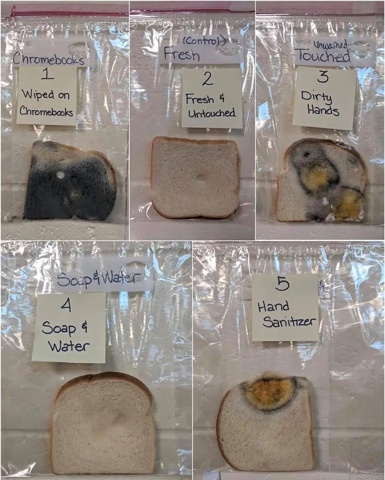 แล้วนำขนมปังไปแยกเก็บในถุงพลาสติกห้าใบเพื่อเพาะเชื้อ ผลที่ได้ทำให้ทุกคนอึ้ง สรุปว่าไม่มีอะไรสะอาดไปกว่าการล้างมือด้วยน้ำและสบู่ค่ะ