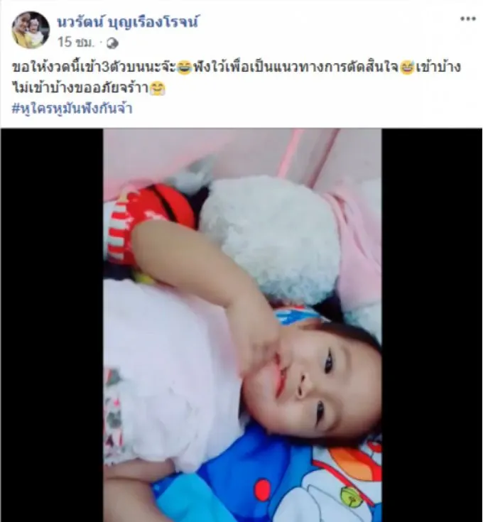 เหลือเวลาอีกไม่กี่วันแล้วจ้า สำหรับการประกาศผลรางวัลสลากกินแบ่งรัฐบาล งวดประจำวันที่ 30 ธันวาคม 2562 เชื่อว่าหลายคนมีเลขในใจกันแล้ว แต่สำหรับใครที่ยังไม่มี วันนี้ทีมงานเราก็ได้นำมาฝากอีกเช่นเคย ล่าสุดผู้ใช้เฟสบุ๊ค “นวรัตน์ บุญเรืองโรจน์” ได้โพสต์คลิปของลูกสาวที่บอกเลข พร้อมระบุข้อความว่า