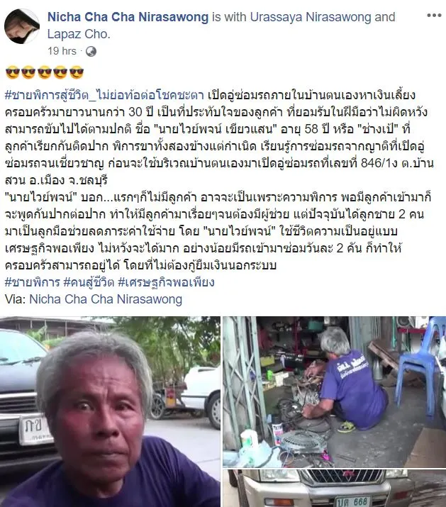 โดยเรื่องราวชายพิการสู้ชีวิตดังกล่าว เผยผ่าน Nicha Cha Cha Nirasawong ชายพิการสู้ชีวิตไม่ย่อท้อต่อโชคชะตา เปิดอู่ซ่อมรถภายในบ้านตนเองหาเงินเลี้ยงครอบครัวมายาวนานกว่า 30 ปี เป็นที่ประทับใจของลูกค้า ที่ยอมรับในฝีมือว่าไม่ผิดหวัง สามารถขับไปได้ตามปกติ ชื่อ “นายไวย์พจน์ เขียวแสน” อายุ 58 ปี หรือ “ช่างเป้” ที่ลูกค้าเรียกกันติดปาก พิการขาทั้งสองข้างแต่กำเนิด เรียนรู้การซ่อมรถจากญาติที่เปิดอู่ซ่อมรถจนเชี่ยวชาญ ก่อนจะใช้บริเวณบ้านตนเองมาเปิดอู่ซ่อมรถที่เลขที่ 846/1ง ต.บ้านสวน อ.เมือง จ.ชลบุรี
