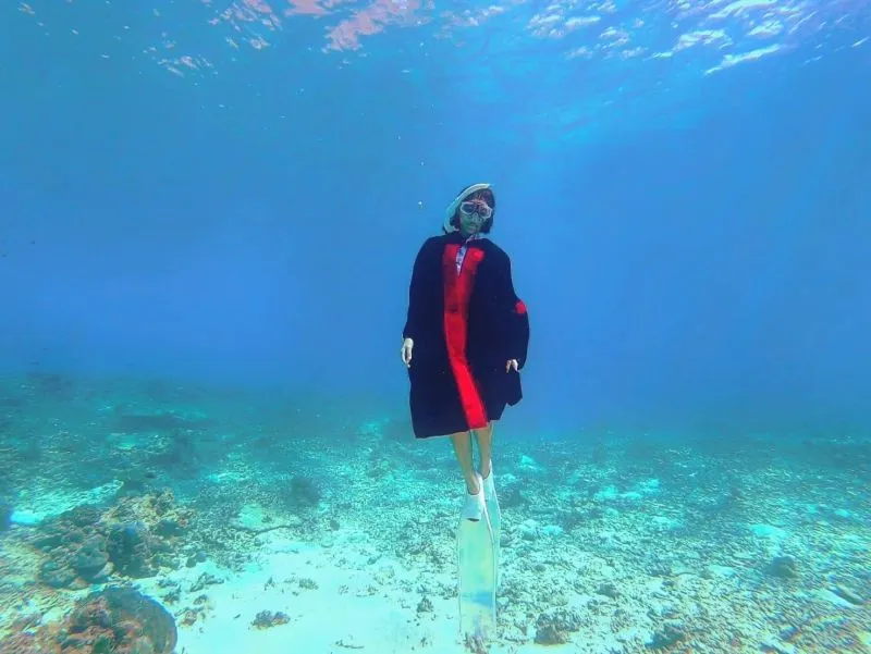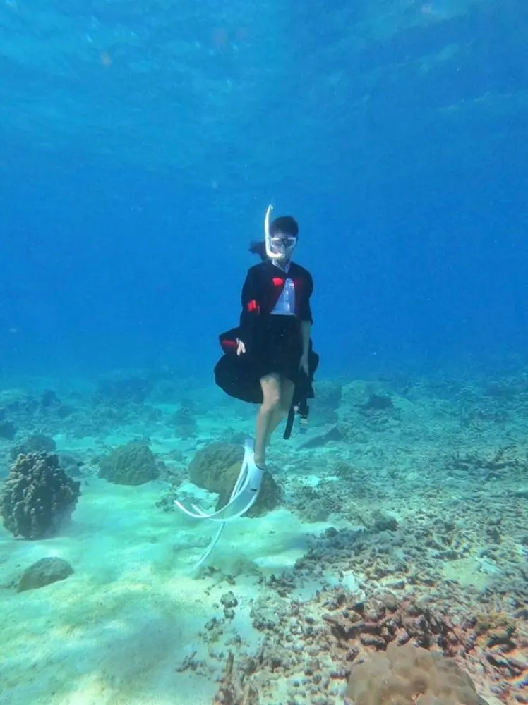 เรียกได้ว่ากลายเป็นไวรัลที่ถูกพูดถึงอย่างมากในขณะนี้ ซึ่งเป็นช่วงที่นักศึกษาหลายสถาบันกำลังอยู่ในช่วงรับปริญญา ล่าสุดในโลกโซเชียลก็ได้ฮือฮาเมื่อผู้ใช้เฟซบุ๊กชื่อ Piyatida Thammala ได้โพสต์ภาพถ่ายชุดครุย ใต้ทะเลบริเวณหมู่เกาะสุรินทร์ จังหวัดพังงา จนได้ช็อตที่สวยงาม แปลกตา ไม่ซ้ำใคร จนชาวเน็ตต้องกดถูกใจกันทั้งโซเชียลำ แต่สำหรับใครที่อยากจะทำตามก็คงต้องไปฝึกดำน้ำกันก่อนนะคะ ไม่ใช่ว่าใครคิดจะทำก็ทำได้เลยง่าย ๆ นะจ๊ะ