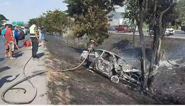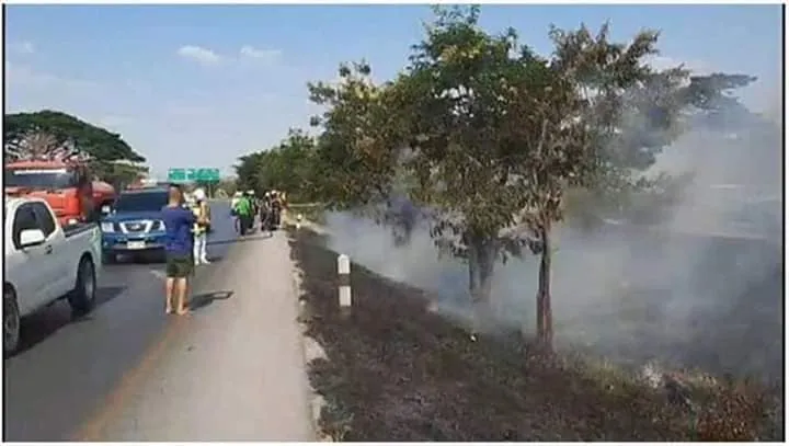 โดยพบรถยนต์ฮอนด้า ซิตี้ ทะเบียน ขท.7128 นครราชสีมา ตกลงร่องกลางถนน ด้านหน้ามีร่องรอยชนเสาคอนกรีตข้างทางและชนต้นไม้ ไฟลุกไหม้รถเสียหายทั้งคัน และยังลุกลามไหม้ป่าหญ้าไปทั่วบริเวณ
