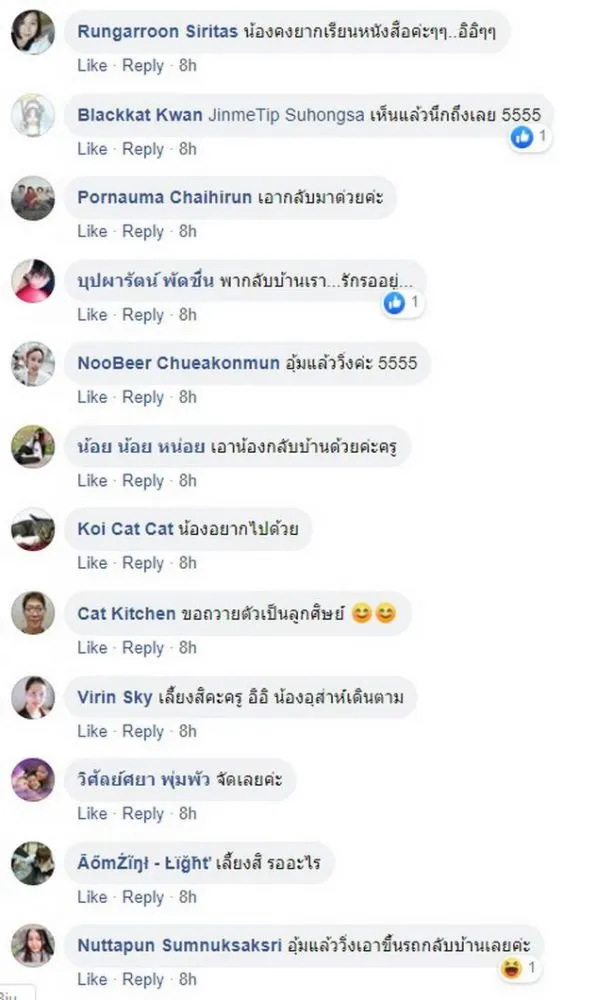หลังจากโพสต์ดังกล่าวถูกเผยแพร่ในกลุ่มทาสแมวก็มีชาวเนตเป็นจำนวนมากเข้ามาเชียร์ให้คุณครูทาสแมวท่านนี้รับเลี้ยงน้องไปเหมือนกัน อีกทั้งยังบอกว่าน้องหน้าตาแบบว่าจริงจังตลกมากๆด้วย