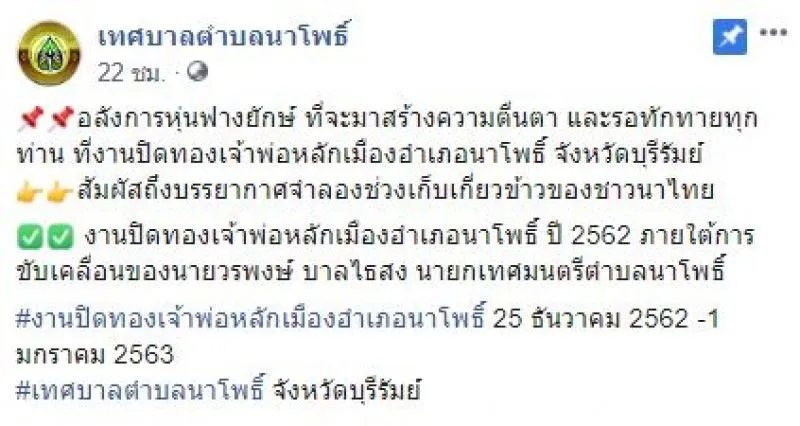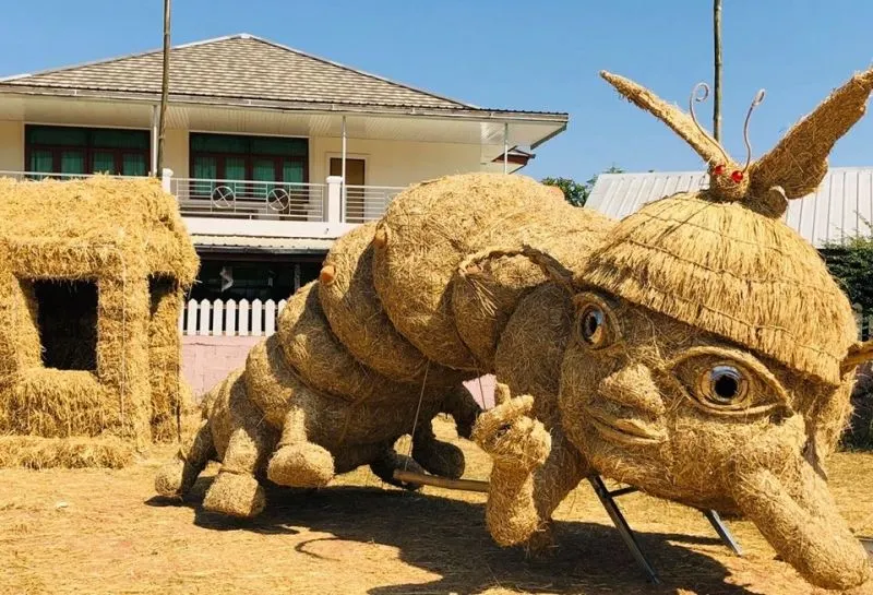 อีกไม่กี่วันนับจากนี้ไปก็จะเป็นช่วงของเทศกาลปีใหม่ในหลายพื้นที่จะมีการจัดกิจกรรมเพื่อต้อนรับนักท่องเที่ยวที่เดินทางมา ไม่ว่าจะเป็นเรื่องของร้านค้าอาหาร สถานที่พักผ่อน หรือสถานที่ถ่ายภาพ เมื่อไม่นานได้มีผู้ใช้เฟซบุ๊กชื่อว่า เทศบาลตำบลนาโพธิ์ ได้โพสต์ภาพและข้อความของการนำก้อนฟางที่ไม่ได้ใช้แล้วมาสร้างให้เป็นรูปสัตว์ สถานที่ เพื่อให้นักท่องเที่ยวได้มาถ่ายภาพเก็บไว้เป็นที่ระลึก โดยมีข้อความระบุว่า อลังการหุ่นฟางยักษ์ ที่จะมาสร้างความตื่นตา และรอทักทายทุกท่าน ที่งานปิดทองเจ้าพ่อหลักเมืองอำเภอนาโพธิ์ จังหวัดบุรีรัมย์