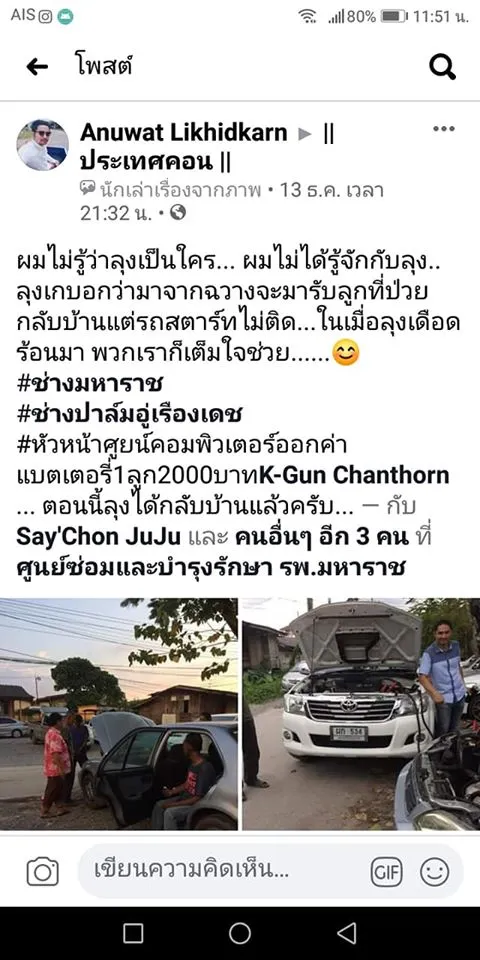 จากที่ก่อนหน้านั้น เจ้าของเฟซบุ๊กชื่อ Anuwat Likhidkarn ได้โพสต์ภาพ ลงในกลุ่ม ประเทศคอน พร้อมระบุข้อความอันน่าประทับใจว่า “ผมไม่รู้ว่าลุงเป็นใคร…ผมไม่ได้รู้จักกับลุง.. ลุงเกบอกว่ามาจากฉวางจะมารับลูกที่ป่วยกลับบ้านแต่รถสตาร์ทไม่ติด…ในเมื่อลุงเดือดร้อนมา พวกเราก็เต็มใจช่วย
