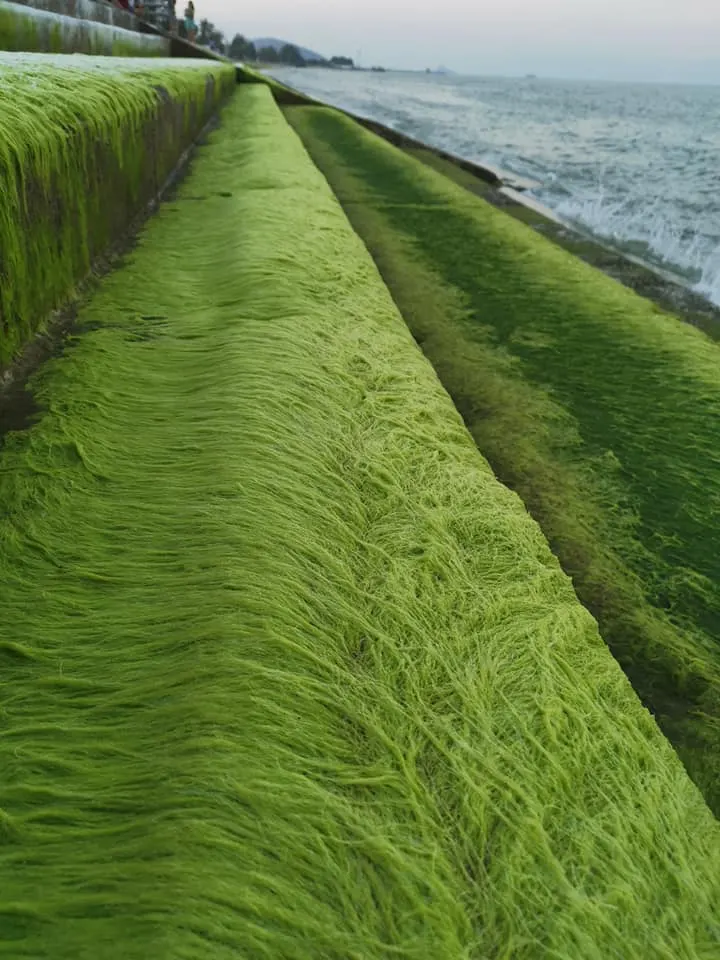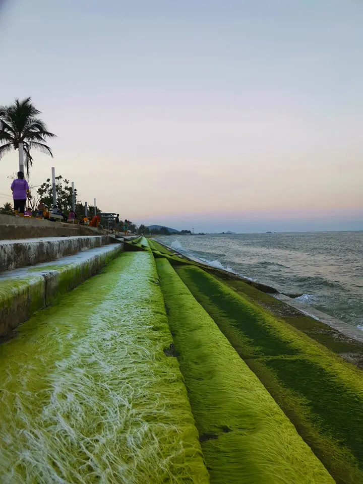 ถือเป็นบรรยากาศ วิวทิวทัศน์อันสวยงามหาชมยาก กับภาพตะไคร่น้ำสีเขียวสดเป็นเเนวยาว เกาะอยู่บริเวณพื้นคอนกรีต ที่จุดชมวิวบันไดเขื่อนกันคลื่นชายหาด ต.ปากน้ำปราณ อ.ปราณบุรี จ.ประจวบคีรีขันธ์