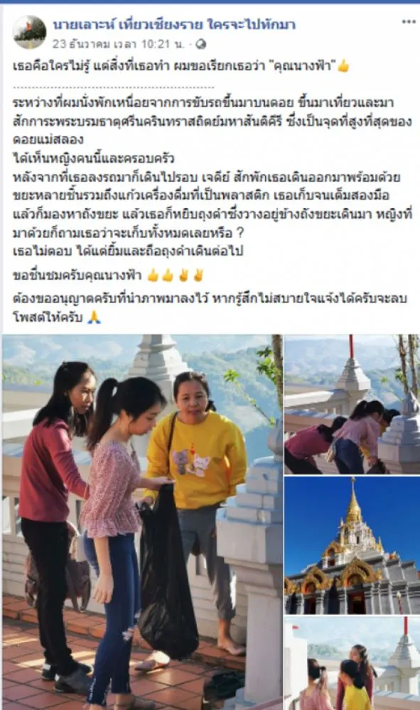 เป็นอีกหนึ่งเรื่องราวที่น่าชื่นชมที่ทำเอาผู้ที่พบเห็นและชาวโซเชียลต่างก็ชื่นชมในการกระทำของหญิงสาวกลุ่มหนึ่ง เดินถือถุงดำเก็บขยะรอบบริเวณ พระบรมธาตุศรีนครินทราสถิตย์มหาสันติคีรี โดยไม่บ่นสักคำ โดยผู้ใช้เฟซบุ๊ก นายเลาะห์ เที่ยวเชียงราย ใครจะไปทักมา ได้โพสต์ภาพและเรื่องราวพร้อมข้อความใจความว่า