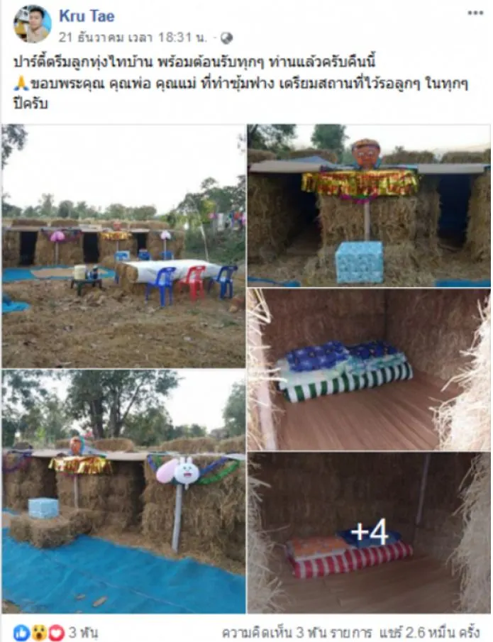 ใกล้วันหยุดยาวช่วงเทศกาลปีใหม่แล้ว หลายๆท่านรอเวลากลับบ้านไปพักผ่อนหย่อนใจ เช่นเดียวกับผู้ใช้เฟสบุ๊ค “Kru Tae” ได้โพสต์ภาพความน่ารักของพ่อแม่ ที่ได้เตรียมสถานที่ต้อนรับลูกชาย ในวันที่ลูกชายมาเยี่ยมบ้านวันปีใหม่ ซึ่งเป็นภาพที่น่ารักมากๆ เพราะพ่อแม่ของผู้โพสต์ ได้นำฟางก้อนมาประกอบกัน จนกลายเป็นห้องพักเล็กๆ ต้องบอกเลยว่าน่ารักมากจ้า