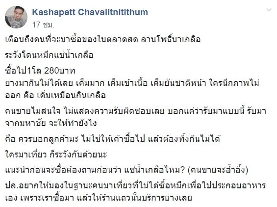 ผู้ใช้เฟซบุ๊กโพสต์ข้อความระบุว่า “เตือนถึงคนที่จะมาซื้อของในตลาดสด ลานโพธิ์นาเกลือ ระวังโดนหมึกแช่น้ำเกลือ ซื้อไป1โล 280บาท ย่างมากินไม่ได้เลย เค็มมาก เค็มเข้าเนื้อ เค็มยันชาติหน้า ใครนึกภาพไม่ออก คือ เค็มเหมือนกินเกลือ คนขายไม่สนใจ ไม่แสดงความรับผิดชอบเลย บอกแค่ว่ารับมาแบบนี้ รับมาจากมหาชัย จะให้ทำยังไง คือ ควรบอกลูกค้ามะ ไม่ใช่ให้เค้าซื้อไป แล้วต้องทิ้งกินไม่ได้”