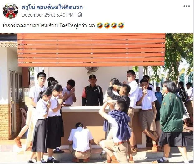 โดยทางเพจ ครูโซ่ สอนศิษย์ให้คิดบวก เวลาขอออกนอกโรงเรียน ใครใหญ่กว่า ผอ. เป็นภาพเหล่านักเรียนระดับมัธยมศึกษากลุ่มใหญ่ กำลังยกมือไหว้อ้อนวอนพี่รปภ.ที่หน้าป้อมของโรงเรียน เพื่อจะได้ออกจากโรงเรียนก่อนเวลาเลิกเรียน หลายๆคนเห็นบรรยากาศเเบบนี้เเล้วคงนึกถึงตัวเองขึ้นมาทันที ต้องมีติดสินบนกันเล็กๆน้อยเพื่อช่วยในการอำนวยความสะดวก