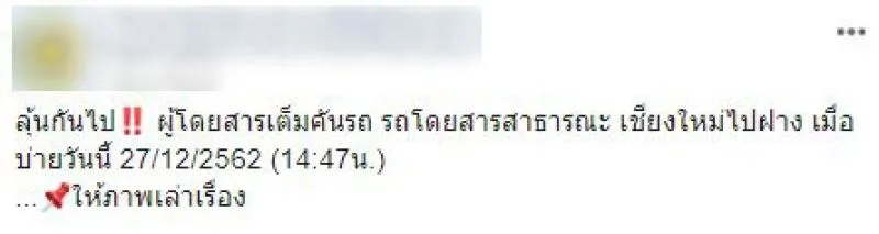 ลุ้นกันไป ผู้โดยสารเต็มคันรถ รถโดยสารสาธารณะ เชียงใหม่ไปฝาง เมื่อบ่ายวันนี้ 27 ธันวาคม 2562 เวลา 14 47 น หลังจากที่โพสต์ข้อความผู้คนในโลกโซเชียลต่างเข้ามาแสดงความคิดเห็นเป็นจำนวนมากกับการกระทำในครั้งนี้ว่า ไม่เหมาะสมเป็นอย่างมาก