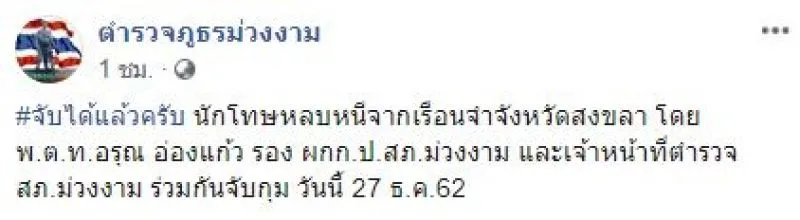 ล่าสุดเจ้าหน้าที่ตำรวจ สภ ม่วงงาม ได้โพสต์ภาพและข้อความของการรวบตัวนักโทษที่หลบหนีระหว่างสอบสวนได้ที่บ้านพักแห่งหนึ่ง มีข้อความระบุว่า จับได้แล้วครับ นักโทษหลบหนีจากเรือนจำจังหวัดสงขลา โดย พตท อรุณ อ่องแก้ว รอง ผกก ป สภ ม่วงงาม และเจ้าหน้าที่ตำรวจ สภ ม่วงงาม ร่วมกันจับกุม วันนี้ 27 ธันวาคม 62