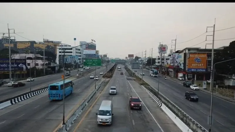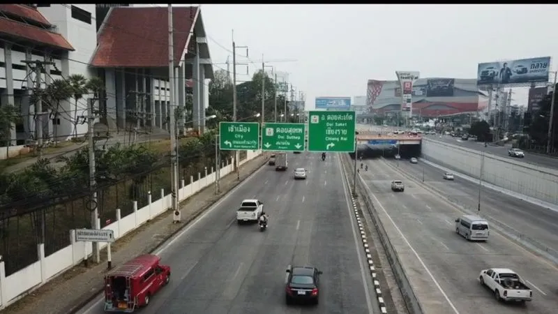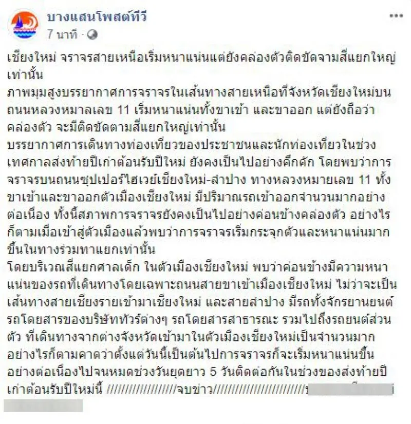 มีข้อความระบุว่า เชียงใหม่ จราจรสายเหนือเริ่มหนาแน่นแต่ยังคล่องตัวติดขัดตามสี่แยกใหญ่เท่านั้น ภาพมุมสูงการจราจรในเส้นทางสายเหนือที่จังหวัดเชียงใหม่บนถนนหลวงหมาลเลข 11 เริ่มหนาแน่นทั้งขาเข้า และขาออก แต่ยังถือว่าคล่องตัว จะมีติดขัดตามสี่แยกใหญ่เท่านั้น การเดินทางท่องเที่ยวของประชาชนและนักท่องเที่ยวในช่วงเทศกาลส่งท้ายปีเก่าต้อนรับปีใหม่ ยังคงเป็นไปอย่างคึกคัก