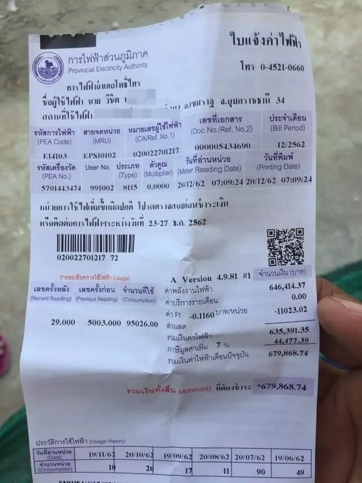 หนุ่มถึงกับเป็นลมเห็นยอดบิลค่าไฟกว่า 6 แสน