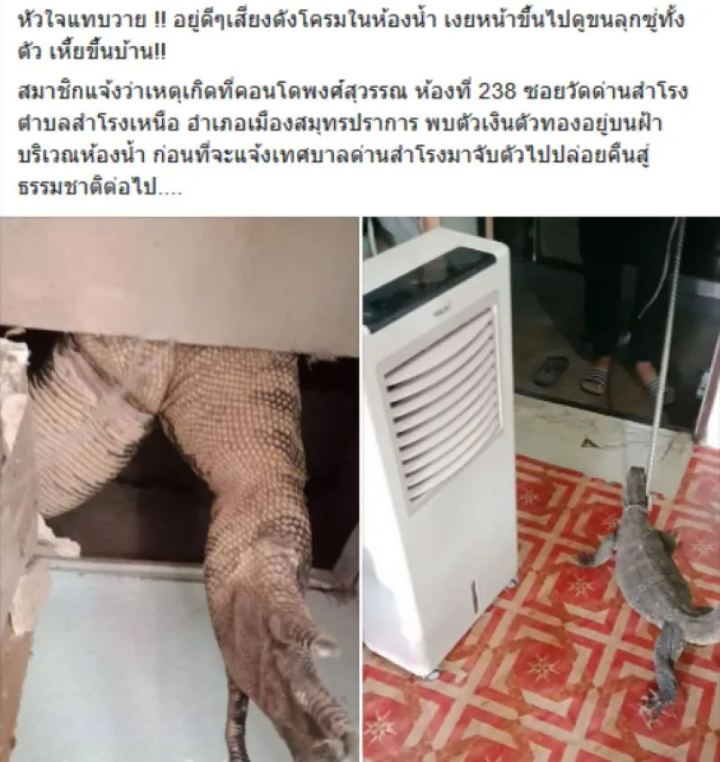 ใกล้จะอกสลากกินแบ่งรัฐบาล งวดประจำวันที่ 30 ธันวาคม 2562 หลายๆคนคงยังตามหาเลขสวย เพื่อเสี่ยงโชค ลองมาดูโพสต์นี้ในเพจข่าว เป็นภาพตัวเงิน ตัวทอง แอบเข้าซุกตัวอยู่ในฝ่าห้องน้ำ โดยเจ้าของบ้านได้ยินดัง จึงได้รีบวิ่งมาดู ตกใจ แจ้งกู้ภัยช่วยด่วน หัวใจแทบวาย อยู่ดีๆเสียงดังโครมในห้องน้ำ เงยหน้าขึ้นไปดูขนลุกซู่ทั้งตัว เ...้ยขึ้นบ้าน สมาชิกแจ้งว่าเหตุเกิดที่คอนโดพงศ์สุวรรณ ห้องที่ 238 ซอยวัดด่านสำโรง ตำบลสำโรงเหนือ อำเภอเมืองสมุทรปราการ พบตัวเงินตัวทองอยู่บนฝ้าบริเวณห้องน้ำ ก่อนที่จะแจ้งเทศบาลด่านสำโรงมาจับตัวไปปล่อยคืนสู่ธรรมชาติต่อไป