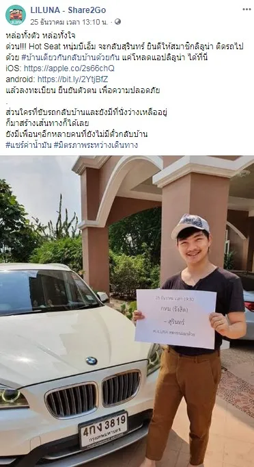 จึงได้เกิด LILUNA ที่จะช่วยให้คนไทยกลับบ้านโดยปลอดภัย โดยทางเพจเฟซบุ๊ค LILUNA Share2Go ได้โพสต์ข้อความระบุว่า " หล่อทั้งตัว หล่อทั้งใจ ด่วน!!! Hot Seat หนุ่มบีเอ็ม จะกลับสุรินทร์ ยินดีให้สมาชิกลิลูน่า ติดรถไปด้วย #บ้านเดียวกันกลับบ้านด้วยกัน แค่โหลดแอปลิลูน่า ได้ที่นี่ แล้วลงทะเบียน ยืนยันตัวตน เพื่อความปลอดภัย"