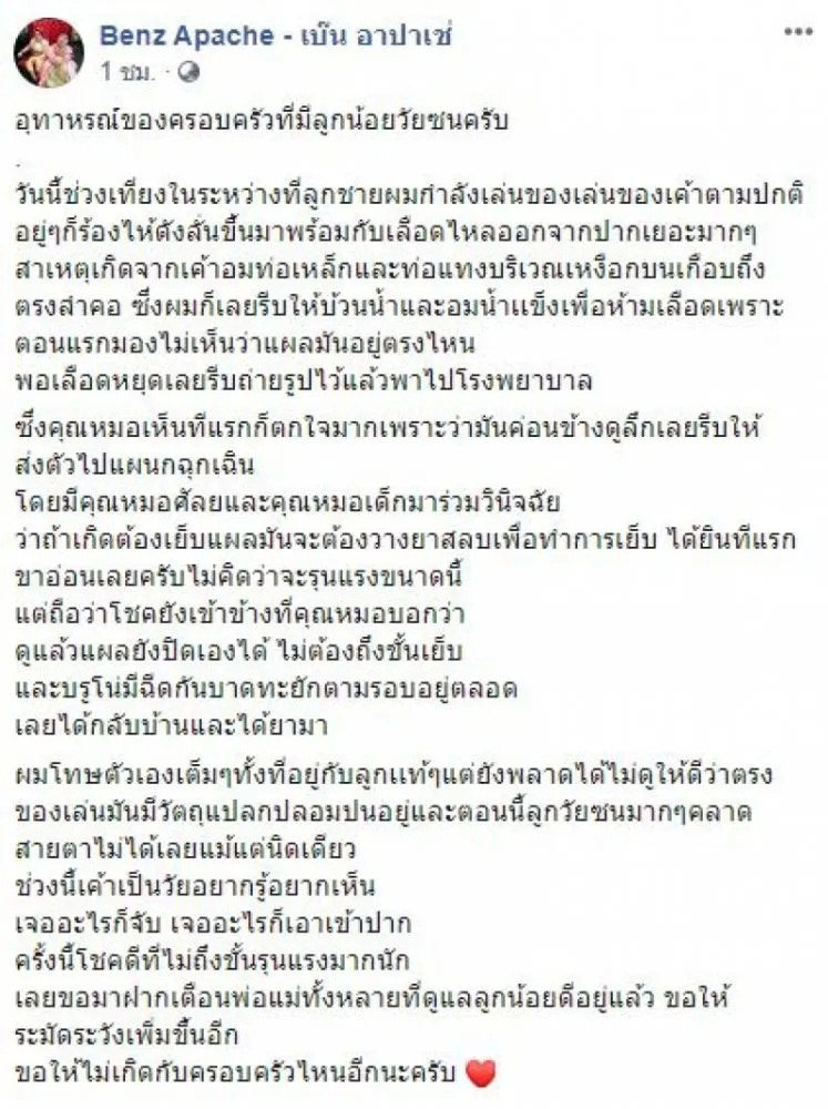 เฟซบุ๊ก Benz Apache เบ๊น อาปาเช่ ที่ได้โพสต์ภาพและข้อความการปล่อยให้ลูกชายเล่นอยู่ในบ้านจนเกิดเหตุการณ์ที่ไม่คาดคิด โดยมีข้อความระบุว่า อุทาหรณ์ของครอบครัวที่มีลูกน้อยวัยซนครับ วันนี้ช่วงเที่ยงในระหว่างที่ลูกชายผมกำลังเล่นของเล่นของเค้าตามปกติ อยู่ๆ ก็ร้องไห้ดังลั่นขึ้นมาพร้อมกับเลือดไหลออกจากปากเยอะมากๆ สาเหตุเกิดจากเค้าอมท่อเหล็กและท่อแทงบริเวณเหงือกบนเกือบถึงตรงลำคอ ซึ่งผมก็เลยรีบให้บ้วนน้ำและอมน้ำเเข็งเพื่อห้ามเลือดเพราะตอนแรกมองไม่เห็นว่าแผลมันอยู่ตรงไหน พอเลือดหยุดเลยรีบถ่ายรูปไว้แล้วพาไปโรงพยาบาล