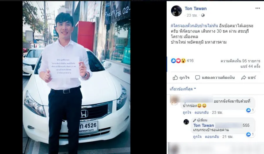 โดยผู้ใช่เฟซบุ๊กชื่อ Ton Tawan ได้โฑสต์ข้อความแสดงน้ำใจของคนไทยว่า “ใครจองตั๋วกลับบ้านไม่ทัน อินบ๊อคมาได้เลยนะครับ พิกัดบางแค เดินทาง 30 ธค ผ่าน สระบุรี โคราช เมืองพล บ้านใหม่ พยัคฆภูมิ มหาสารคาม” ซึ่งทำให้ชาวเน็ตและเพื่อนๆ ในเฟซบุ๊กของเขาเข้ามาแสดงความชื่นชมเป็นจำนวนมาก
