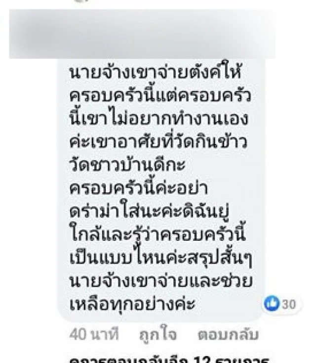 นอกจากนี้ยังมีชาวโซเชียลรายหนึ่งที่บอกว่าเป็นคนที่อยู่ใกล้และค่อนข้างที่จะทราบเรื่องราวเกี่ยวกับครอบครัวนี้เข้ามาแสดงความคิดเห็นว่า นายจ้างเขาจ่ายตังค์ให้ครอบครัวนี้แต่ครอบครัวนี้เขาไม่อยากทำงานเองค่ะเขามาอาศัยวัดกินข้าววัดชาวบ้านดีกับครอบครัวมีค่ะอย่าดราม่าใส่นะคะดิฉันอยู่ใกล้แล้วรู้ว่าครอบครัวนี้เป็นแบบไหนค่ะสรุปสั้นๆนายจ้างเขาจ่ายและช่วยเหลือทุกอย่างค่ะ