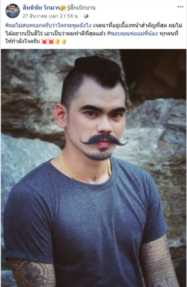 อย่างไรก็ตามเจ้าของเฟซบุ๊กต้นเรื่องได้โพสต์ข้อความระบุอีกว่า ผมไม่สนหรอกครับว่าใครจะพูดยังไงเจตนาอยู่ที่เบื้องหน้าสำคัญที่สุดผมไม่อยากเป็นฮีโร่เอาเป็นว่าผมทำดีที่สุดแล้วขอบคุณพ่อแม่พี่น้องทุกคนที่ให้กำลังใจครับ