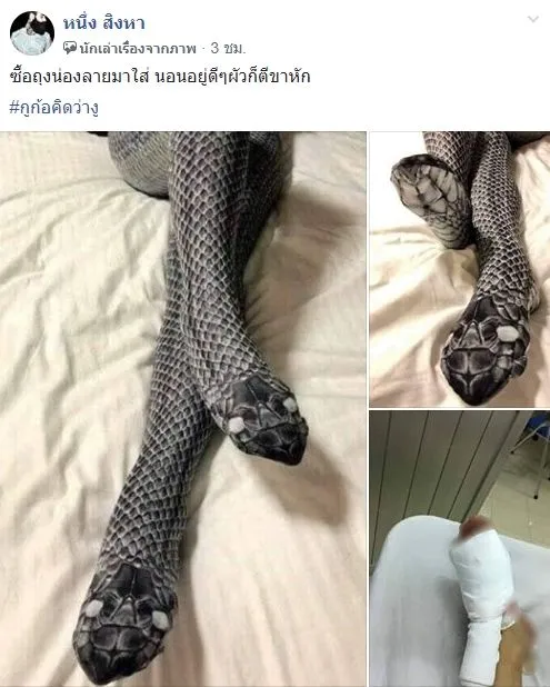 อย่างไรก็ตาม หลังจากหญิงสาวคนดังกล่าวนำถุงน่อง ลายงู มาลองสวมใส่ได้ไม่นาน ดันถูกสามีเข้าใจผิด คิดว่าเป็นงูจริง ก่อนจะลงมือหวดเข้าไปอย่างจัง จนกระทั่ง “ขาหัก” ต้องพากันหามตัวส่งโรงพยาบาลเพื่อเข้ารับการรักษาอย่างเร่งด่วน