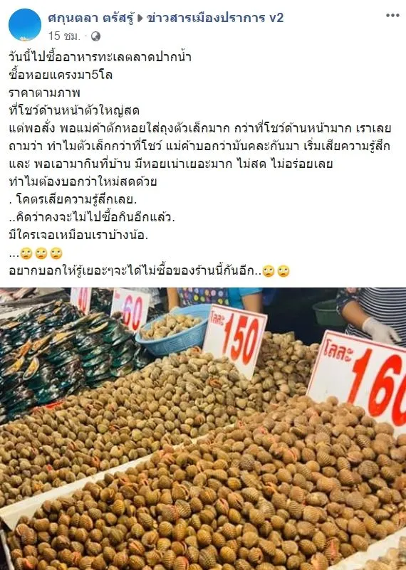 ผู้ใช้เฟซบุ๊กโพสต์ข้อความระบุว่า วันนี้ไปซื้ออาหารทะเลตลาดปากน้ำ ซื้อหอยแครงมา5โล ราคาตามภาพ ที่โชว์ด้านหน้าตัวใหญ่สด แต่พอสั่ง พอแม่ค้าตักหอยใส่ถุงตัวเล็กมาก กว่าที่โชว์ด้านหน้ามาก เราเลยถามว่า ทำไมตัวเล็กกว่าที่โชว์ แม่ค้าบอกว่ามันคละกันมา เริ่มเสียความรู้สึกและ พอเอามากินที่บ้าน มีหอยเน่าเยอะมาก ไม่สด ไม่อร่อยเลย ทำไมต้องบอกว่าใหม่สดด้วย