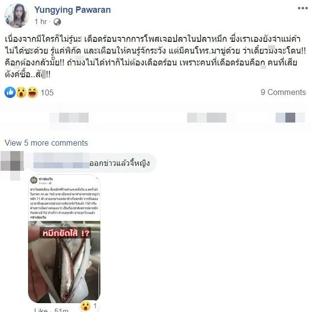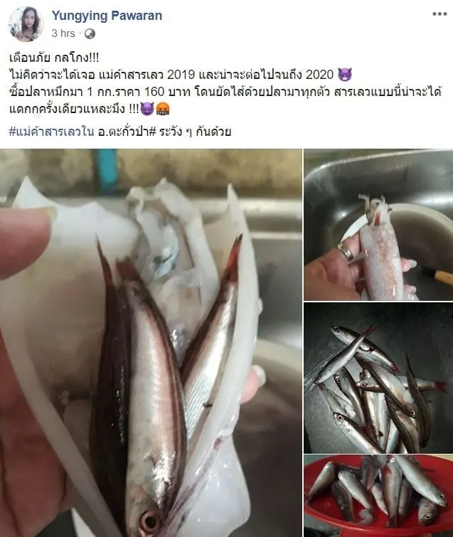 โดยทางผู้ใช้เฟซบุ๊ค Yungying Pawaranเปิดเผยว่า เตือนภัย กลโกง!!!ไม่คิดว่าจะได้เจอ แม่ค้าสารเลว 2019 และน่าจะต่อไปจนถึง 2020 ซื้อปลาหมึกมา 1 กก. ราคา 160 บาท โดนยัดไส้ด้วยปลามาทุกตัว สารเลวแบบนี้น่าจะได้แดกกุครั้งเดียวแหละมึ* แม่ค้าสารเลวใน อ.ตะกั่วป่า ระวัง ๆ กันด้วย