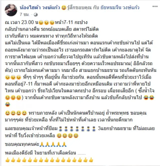 เรียกได้ว่าสังคมทุกวันนี้ไว้ใจใครแทบไม่ได้จริงๆ แต่ก็ใช่ว่าจะไม่มีคนดีในสังคมซะเลย อย่างเช่นเรื่องราวต่อไปนี้ เมื่อวันที่ 30 ธันวาคม ผู้ใช้เฟสบุ๊คชื่อว่า น้องไฮด้า วงษ์แก้ว ได้โพสต์ข้อความระบุว่า ณ.เวลา 23 น หน้า7 11 กะปาง กลับบ้านกลางคืน รถหม้อแบตเสีย สตาร์ทไม่ติด เรากับพี่สาว หมดหนทาง ทำทุกวิถีทางให้รถติด แต่ไม่เป็นผล ได้มีพลเมืองดีขี่รถเก่งผ่านมา ตอนแรกเขาก็ขับผ่านไป แต่ได้ถอยหลังมาถามว่ารถเป็นอะไร เราบอกรถสตาร์ทไม่ติด เขาก็ลงมาดูให้ จัดการชาร์จไฟแบต เขาบอกว่าเดี๋ยวจะไปยูเทิร์น เเล้วขับตามหลังไปส่งที่บ้าน