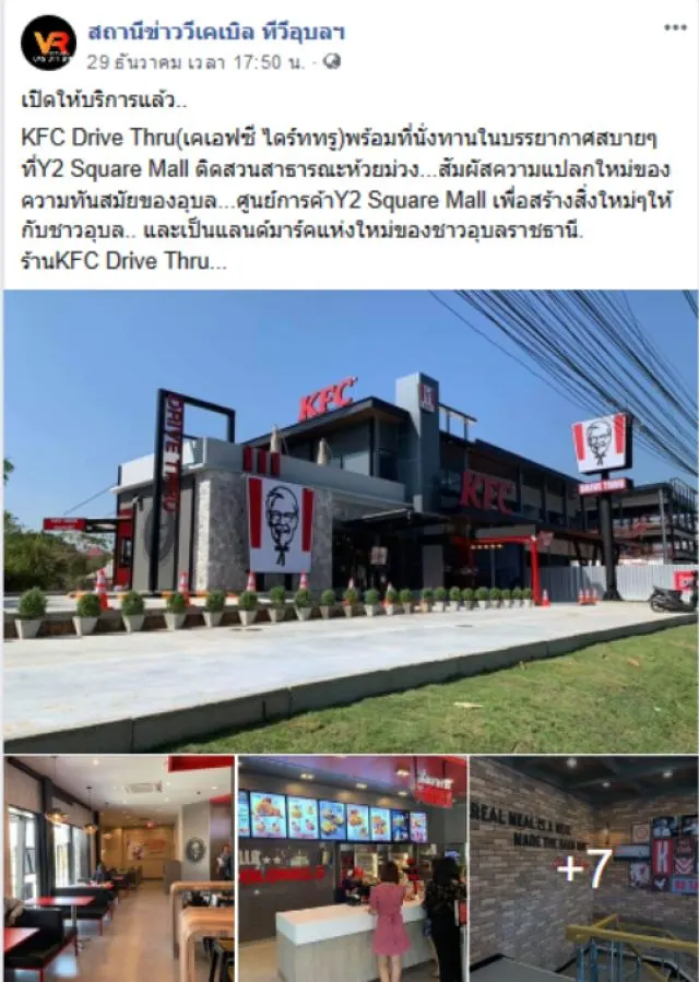 ล่าสุด ได้มีร้าน KFC Drive Thru เคเอฟซีไดร์ฟทรู ได้เปิดให้บริการลูกค้าที่อยากมาซื้อของแต่ไม่อยากลงจากรถ ได้เปิดให้บริการแล้วโดยเพจเฟซบุ๊ค สถานีข่าววีเคเบิล ทีวีอุบลฯ ได้เผยภาพร้านเคเอฟซีดังกล่าวพร้อมระบุข้อความใจความว่า