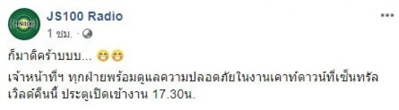 หลายพื้นที่มีการเตรียมความพร้อมเพื่อต้อนรับนักท่องเที่ยวที่จะมาร่วมกิจกรรมในครั้งนี้เป็นอย่างดี ล่าสุดได้มีผู้ใช้เฟซบุ๊กเพจ JS100 Radio ได้โพสต์ภาพและข้อความของเจ้าหน้าที่ตำรวจที่เตรียมความพร้อมดูแลเรื่องความปลอดภัยให้กับผู้ที่จะเดินทางมาร่วมงาน โดยมีข้อความระบุว่า ก็มาดิคร้าบ เจ้าหน้าที่ ทุกฝ่ายพร้อมดูแลความปลอดภัยในงานเคาท์ดาวน์ที่เซ็นทรัลเวิลด์คืนนี้ ประตูเปิดเข้างาน เวลา 17.30 น.