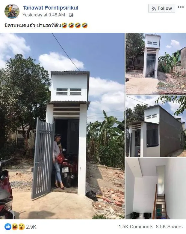 โดยทางผู้ใช้เฟซบุ๊ค Tanawat Porntipsirikul โพสต์ภาพบ้านพร้อมข้อความ มีครบหมดแล้ว บ้านรถที่ดิน ซึ่งก็กลายเป็นกระเเสในโลกออนไลน์มียอดไลค์ยอดเเชร์อย่างล้นหลามเพียงเเค่ระยะเวลาไม่นาน ซึ่งบ้านหลังดังกล่าวไม่ได้อยู่ในประเทศไทย โดยด้านหน้าประตูทางเข้าอาจจะดูขนาดเล็กเเคบ เเค่พอมอเตอร์ไซค์จอด เเต่ถ้าสังเกตให้ดี บ้านดูเหมือนจะลึกเเละอาจจะยาวไปเชื่อมต่อกับด้านหลังก็เป็นได้ ภายในบ้านก็ดูเรียบง่าย มีบันไดเล็กๆขึ้นไปอีกชั้นหนึ่งด้วย