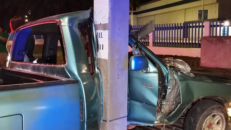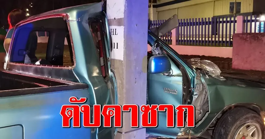 หนุ่มซิ่งปิกอัพชนเสาไฟฟ้า ร่างอัดติดคารถ